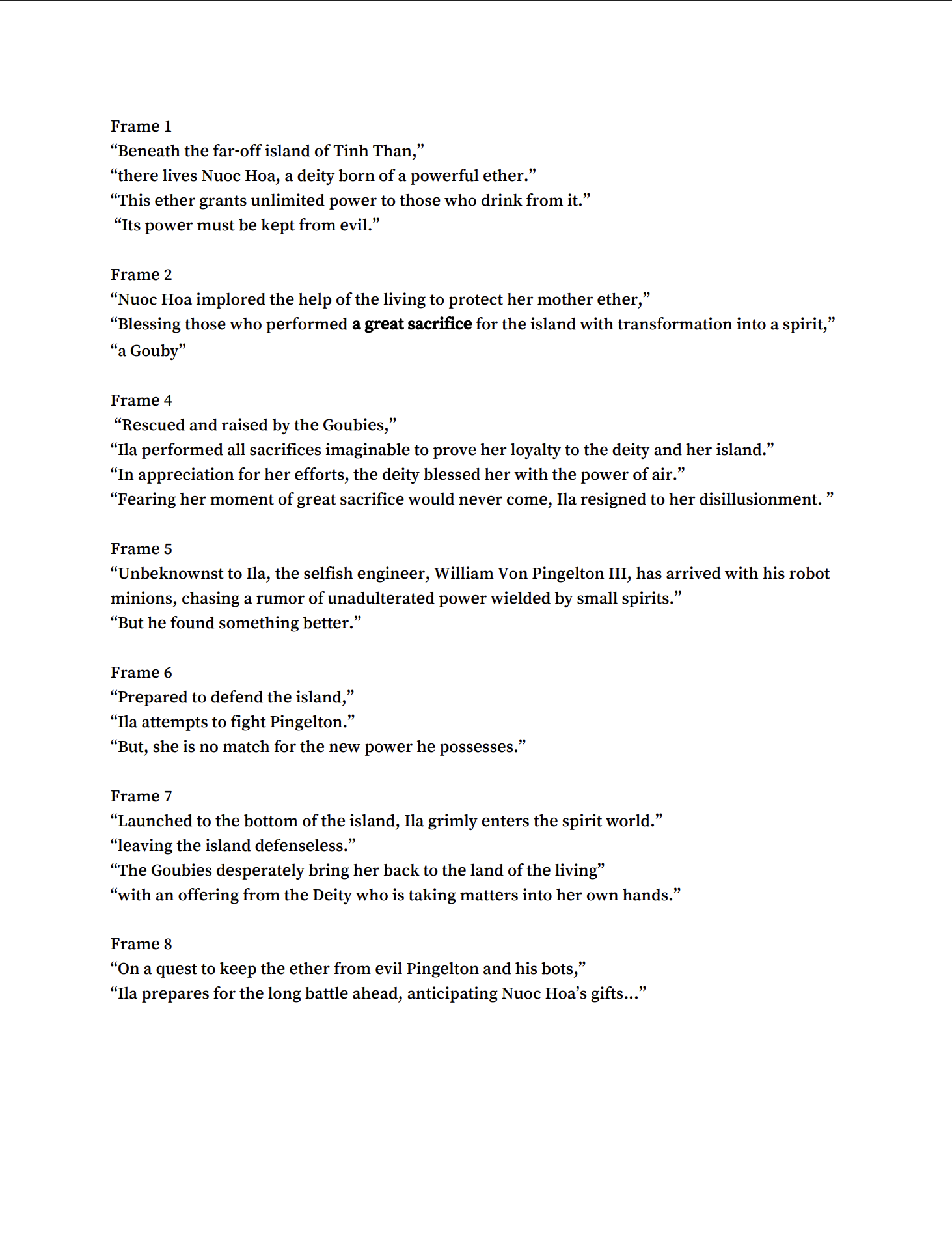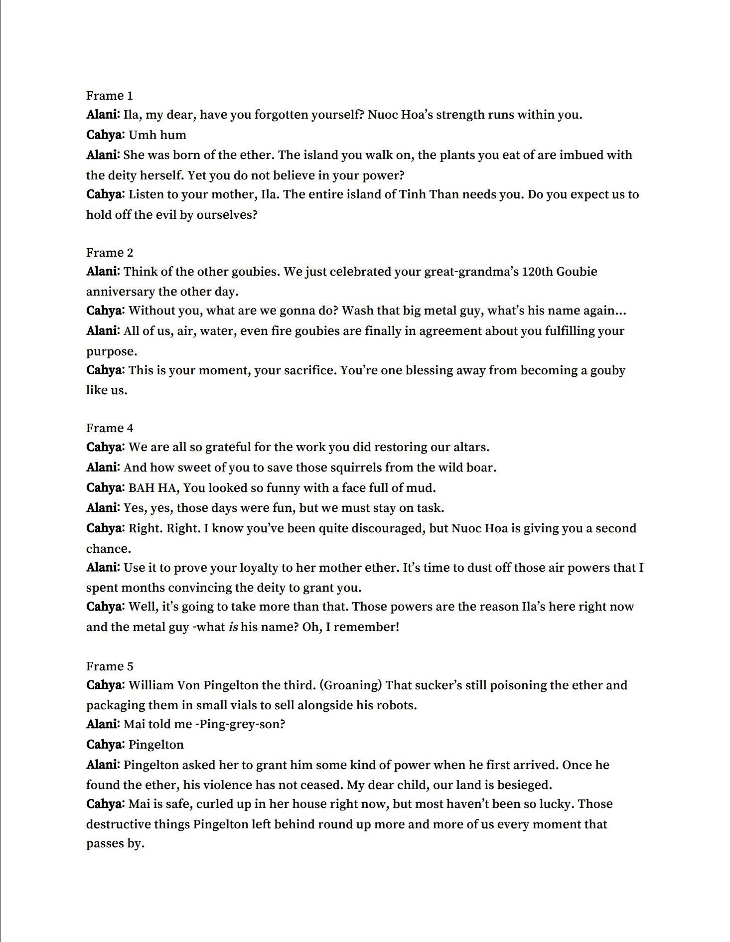 To improve the beginning, middle, and end of the gameplay, I built out the world, characters, and magical forces of the island. I created several documents, like character sheets, high-level game arc overviews, cultural references, and island culture and magic explanations.